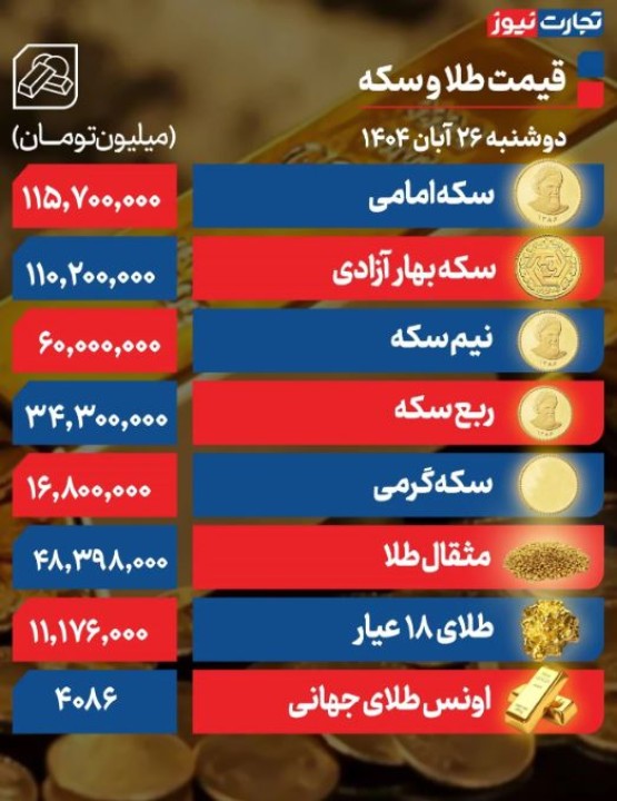 قیمت طلا و سکه امروز شنبه 24 آبان 1404">قیمت طلا و سکه امروز دوشنبه 26 آبان 1404 در روند صعودی بازگشایی شد. قیمت سکه در تمامی قطعات غیر از سکه گرمی افزایش یافت و سکه امامی به کانال 116 میلیونی نزدیک شد. قیمت طلا و سکه امروز چهارشنبه 21 آبان 1404">قیمت طلا نیز بالا رفت و طلای 18 عیار به سقف کانال 11 میلیون و 100 هزار تومانی رسید.