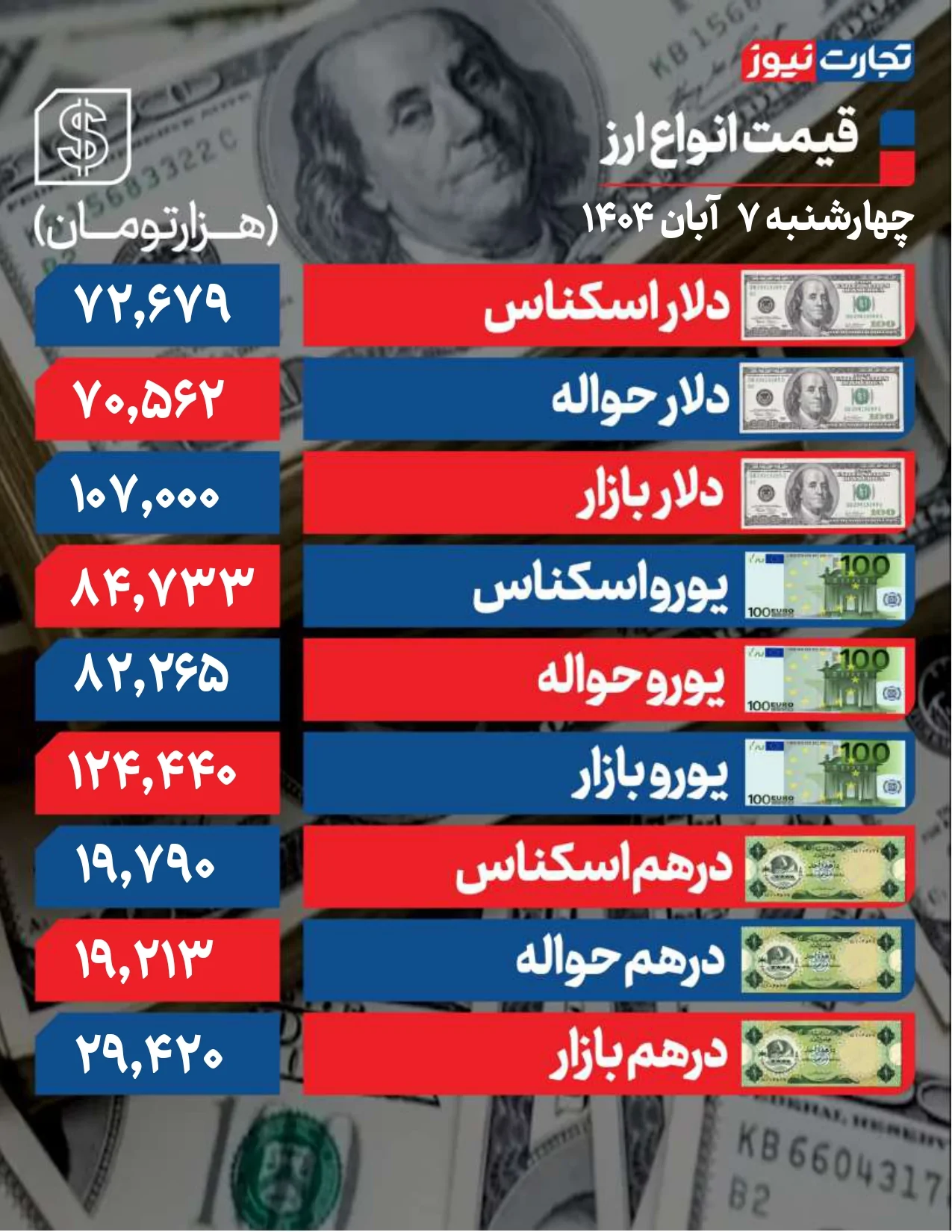جزئیات قیمت دلار امروز چهارشنبه 7 آبان 1404